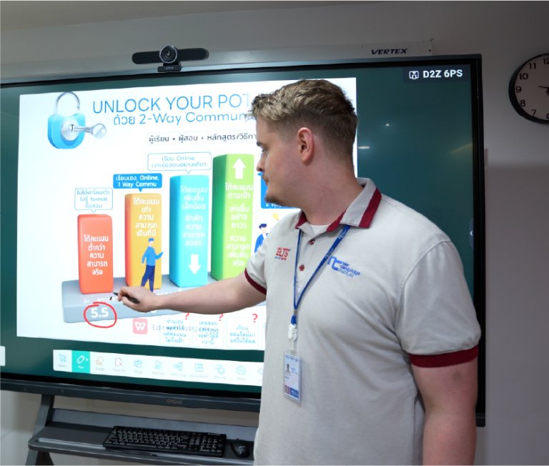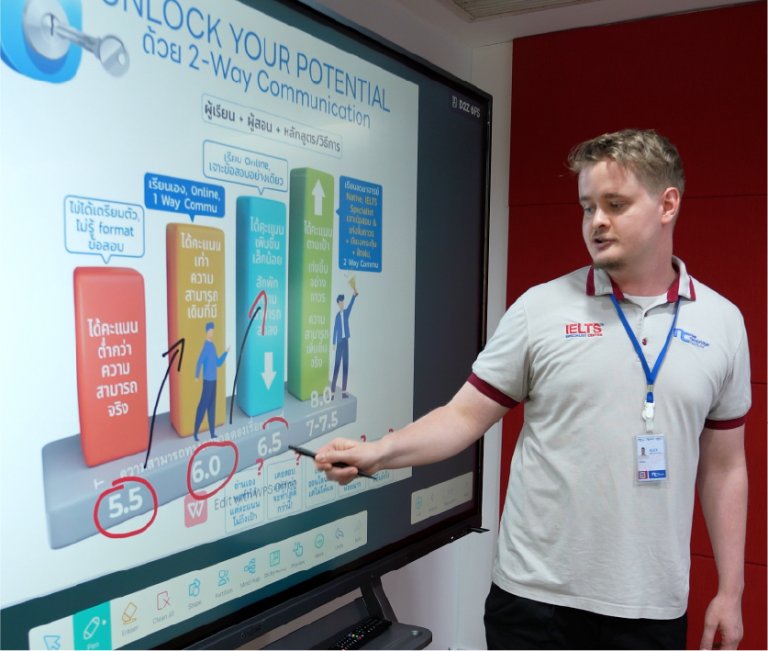 นักเรียนของเราจะมีโอกาสใช้เคล็ดลับและเทคนิคเหล่านั้น ผ่านการฝึกฝน และกิจกรรมต่างๆ ทั้งในและนอกห้องเรียน และยังได้ฝึกทักษะการเขียนและพูด ซึ่งเป็นทักษะที่ยากสำหรับนักเรียนไทย แต่สามารถทำคะแนนขึ้นได้ง่าย ถ้าได้รับเทคนิคที่ครบถ้วน อีกทั้งนักเรียนจะได้รับการประเมินผล และคำแนะนำจากอาจารย์ Native, IELTS Specialists ผ่านระบบ Full Mock Test ขอสอบ IELTS เสมือนจริง ยิ่งได้รับคำแนะนำมาก ยิ่งฝึกมาก ทำให้พัฒนาได้มายิ่งขึ้น