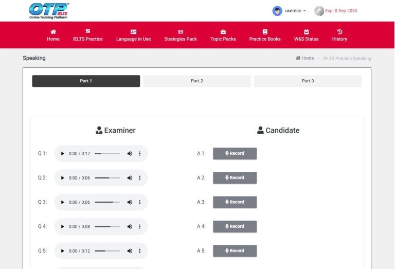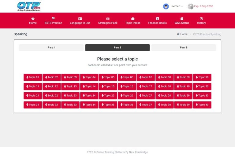 เลือกหัวข้อจากสามตัวเลือกที่มี (Parts 1-3) แต่ละส่วนจะเน้นทักษะการพูดในแง่มุมที่แตกต่างกัน