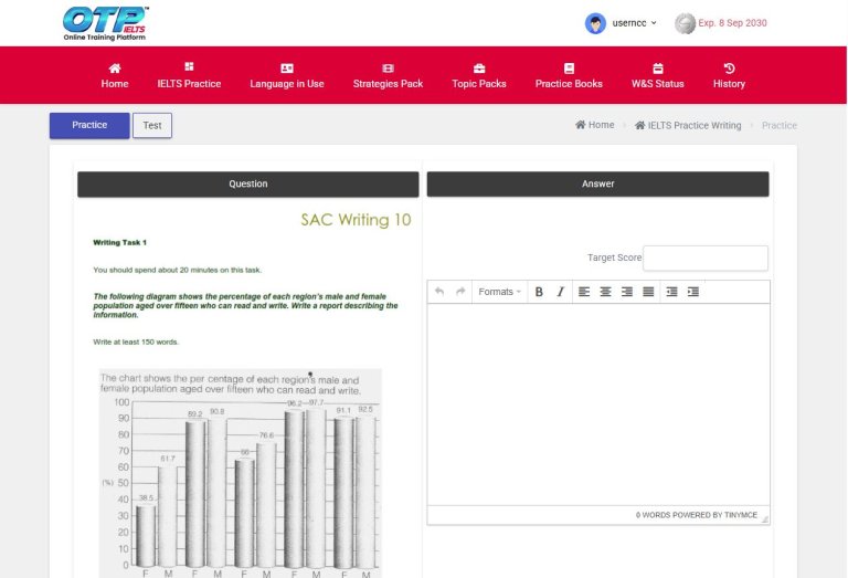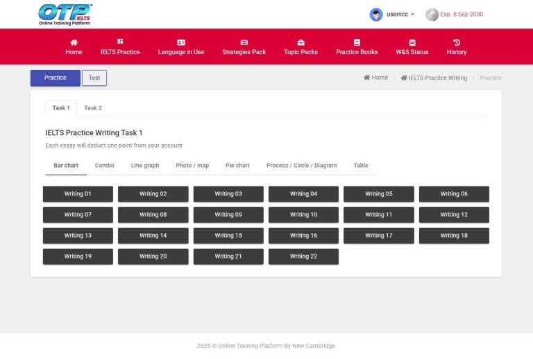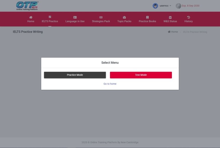 2. Test Mode (1 Hour) – โหมดทดสอบ (1 ชั่วโมง) : ทำทั้ง Task 1 และ Task 2 ให้เสร็จ เลือกหัวข้อและส่งคำตอบ ใช้คะแนนการเขียน 2 คะแนนต่อการทดสอบ 1 ครั้ง